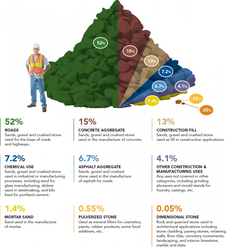 Not all aggregate is the same. For example, 8,000 tonnes of stone, sand and gravel are required per 1 km of a single-lane roadway. While subgrade and subbase materials can vary, asphalt and concrete used for roads demand specific high-quality aggregate. Large infrastructure projects, such as the Trafalgar Memorial Hospital, require about 300,000 tonnes of aggregate, most of which is concrete, made with high-quality aggregate.